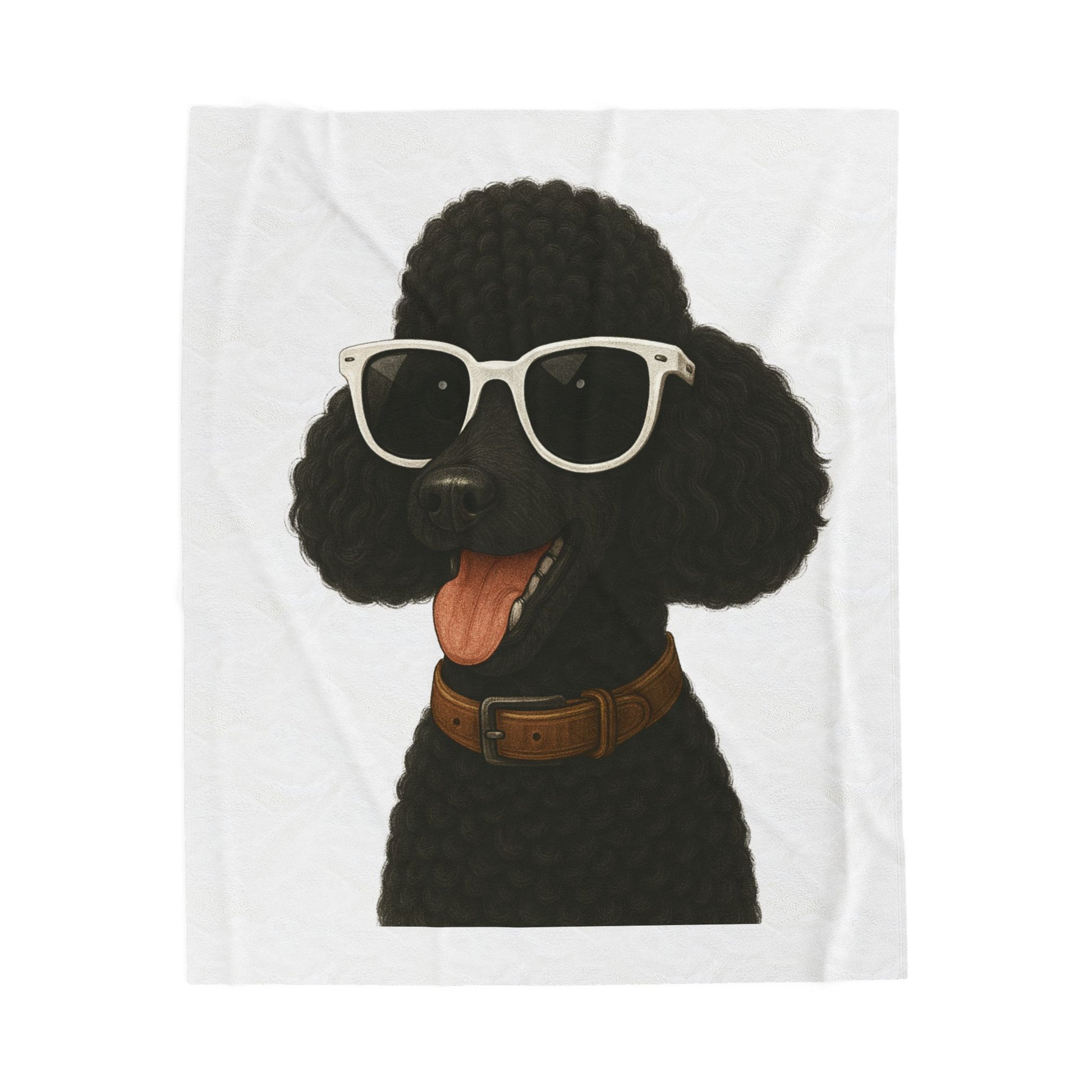 Snuggle up with this cozy Black Poodle sherpa blanket! Featuring a vibrant illustrated Black Poodle portrait wearing cool sunglasses, this blanket combines comfort with dog-lover style.
