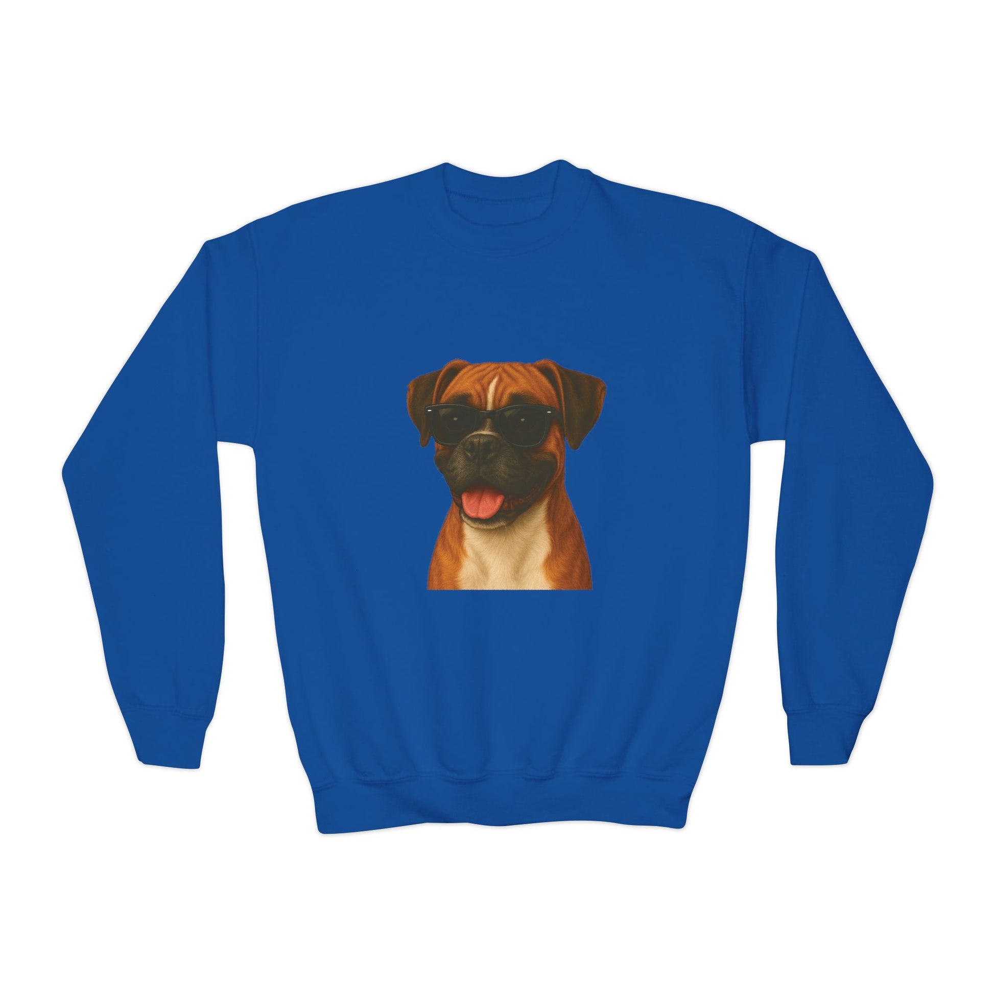 A trendy Youth Sweatshirt featuring a portrait of a Boxer Dog wearing cool black sunglasses. This sweatshirt exudes a fun and playful vibe, perfect for children who love dogs and want to make a fashion statement. Ideal for casual wear and could be a great gift for birthdays or holidays.