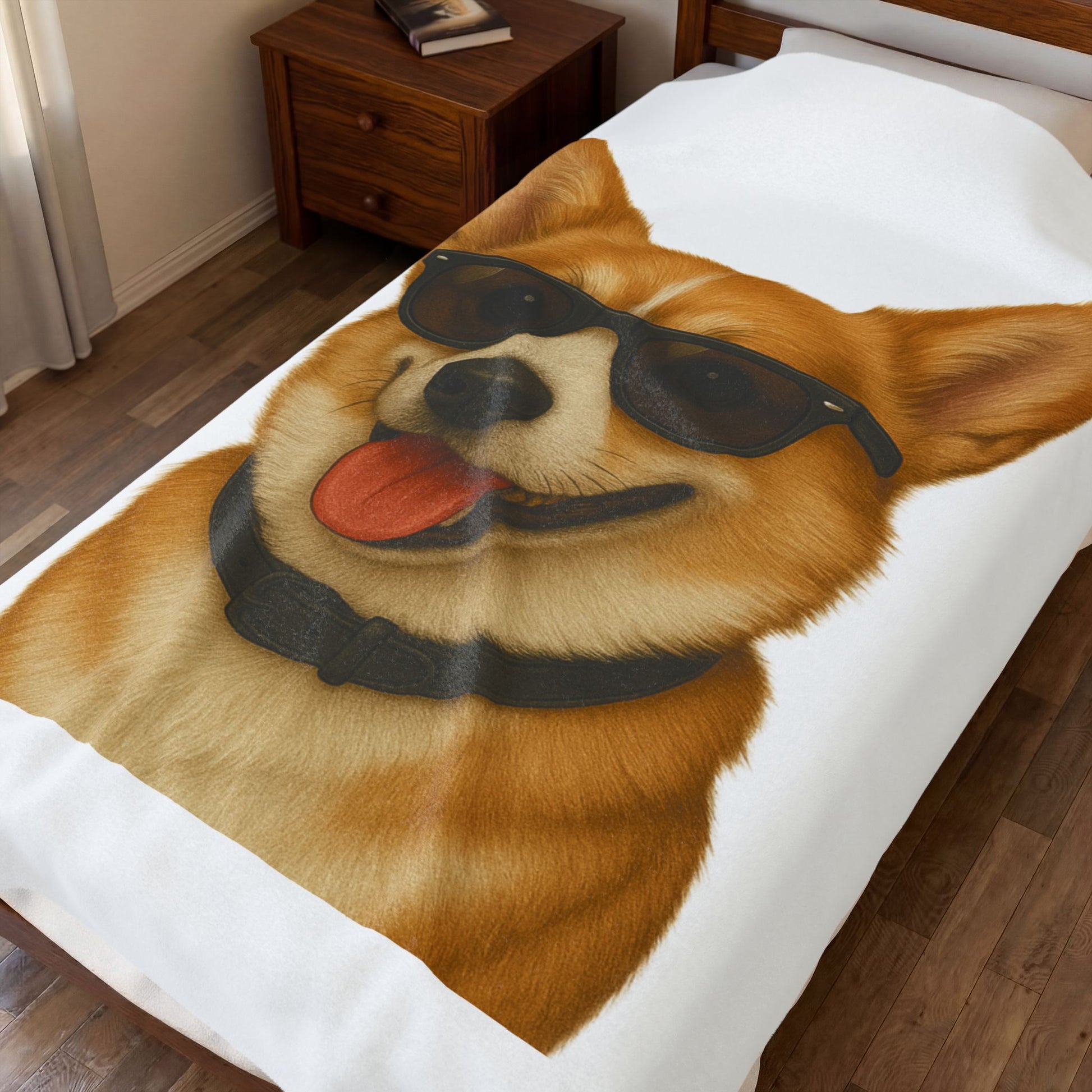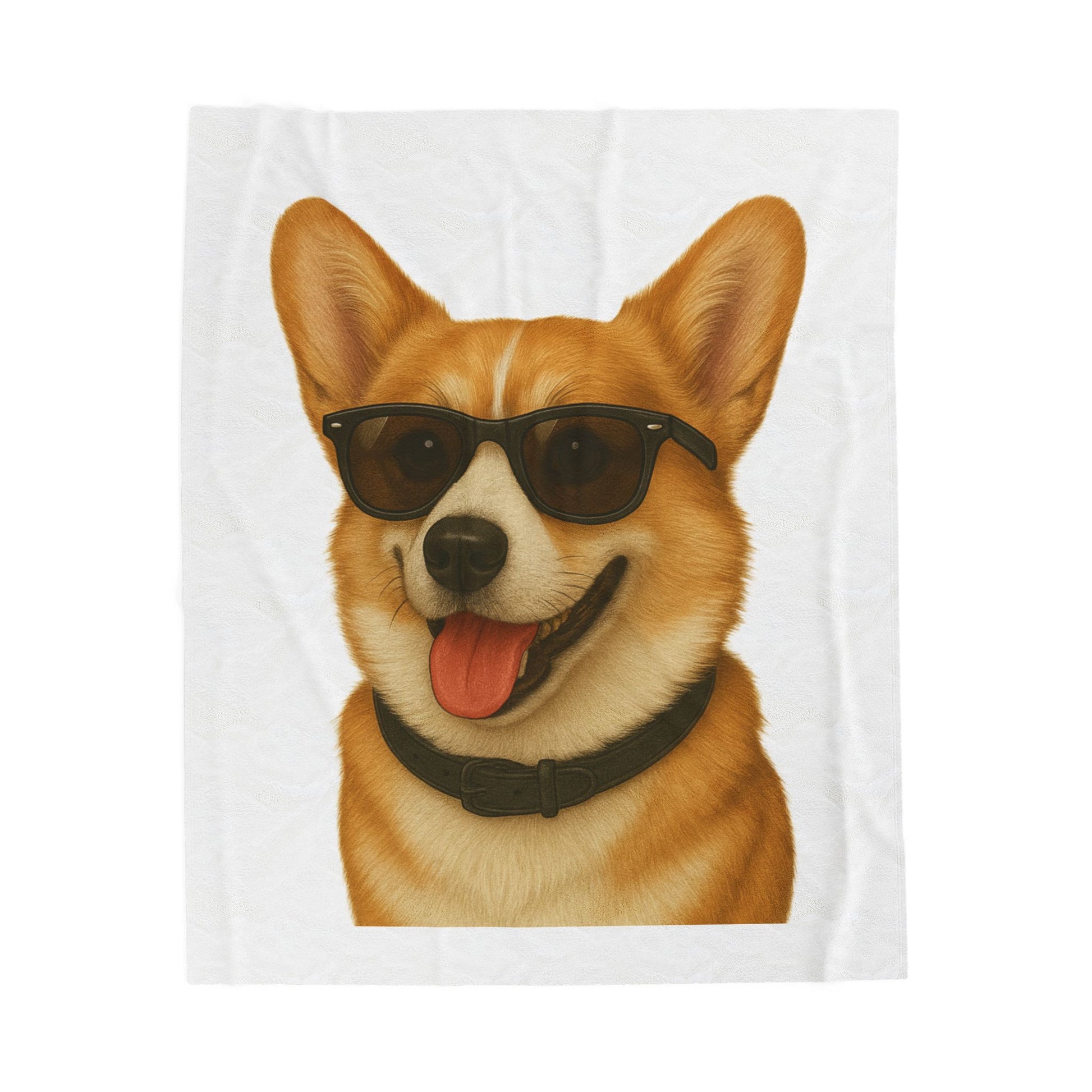 Snuggle up with this cozy Corgi sherpa blanket! Featuring a vibrant illustrated Corgi portrait wearing cool sunglasses, this blanket combines comfort with dog-lover style.