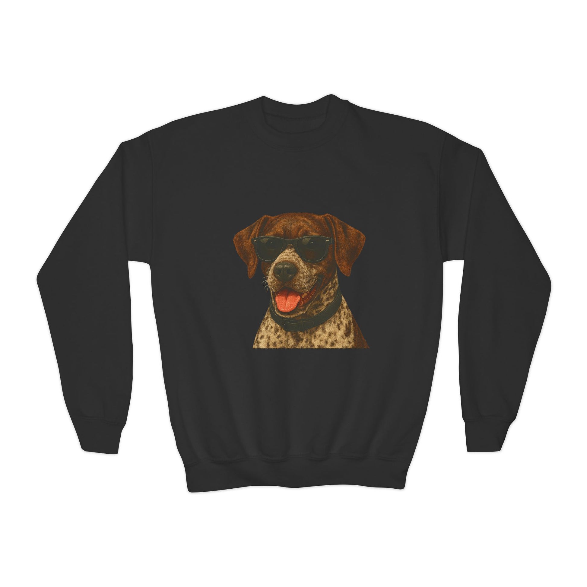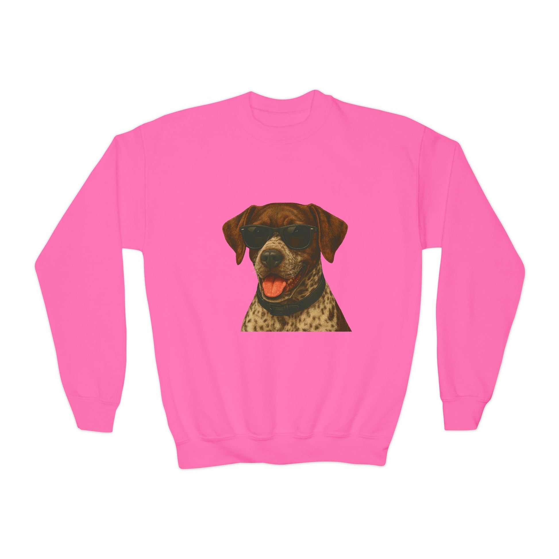 Keep your young dog lover cozy with this adorable German Shorthaired Pointer youth crewneck sweatshirt! Featuring a fun illustrated German Shorthaired Pointer portrait wearing cool sunglasses, this sweatshirt is perfect for kids who love dogs.