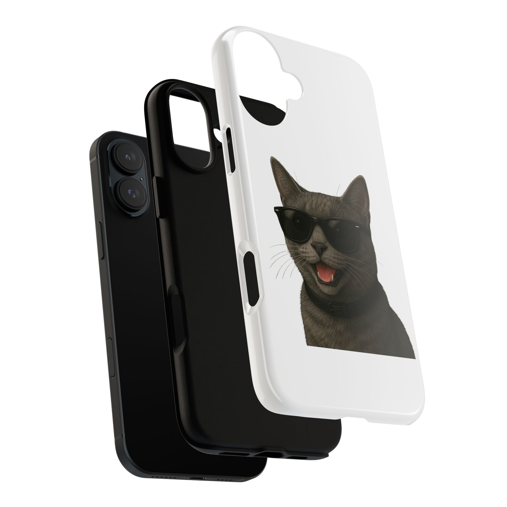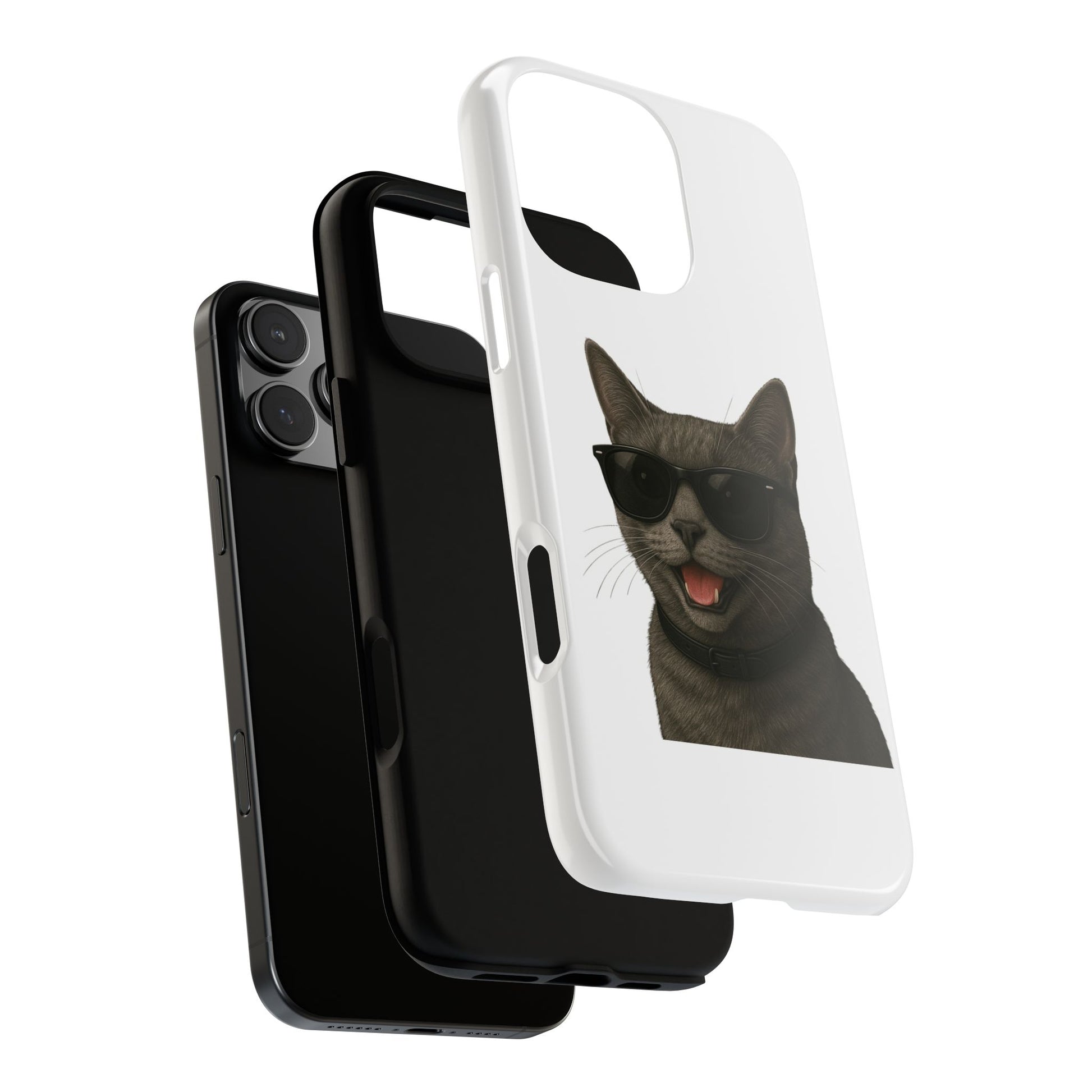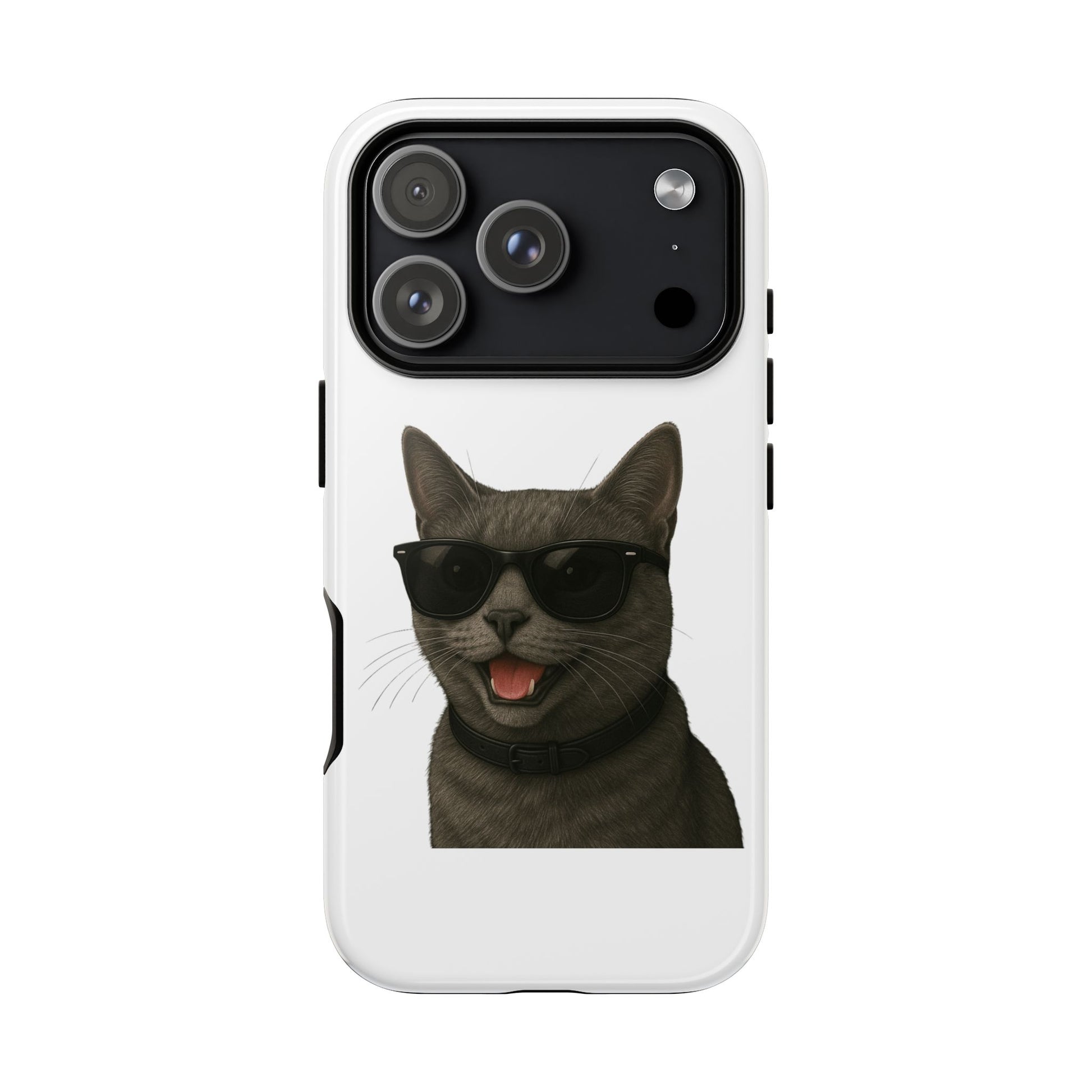 Show off your love for gray cats with this durable tough phone case! Featuring an adorable illustrated Gray Cat portrait wearing cool sunglasses, this case is perfect for cat lovers who want to protect their phone in style.