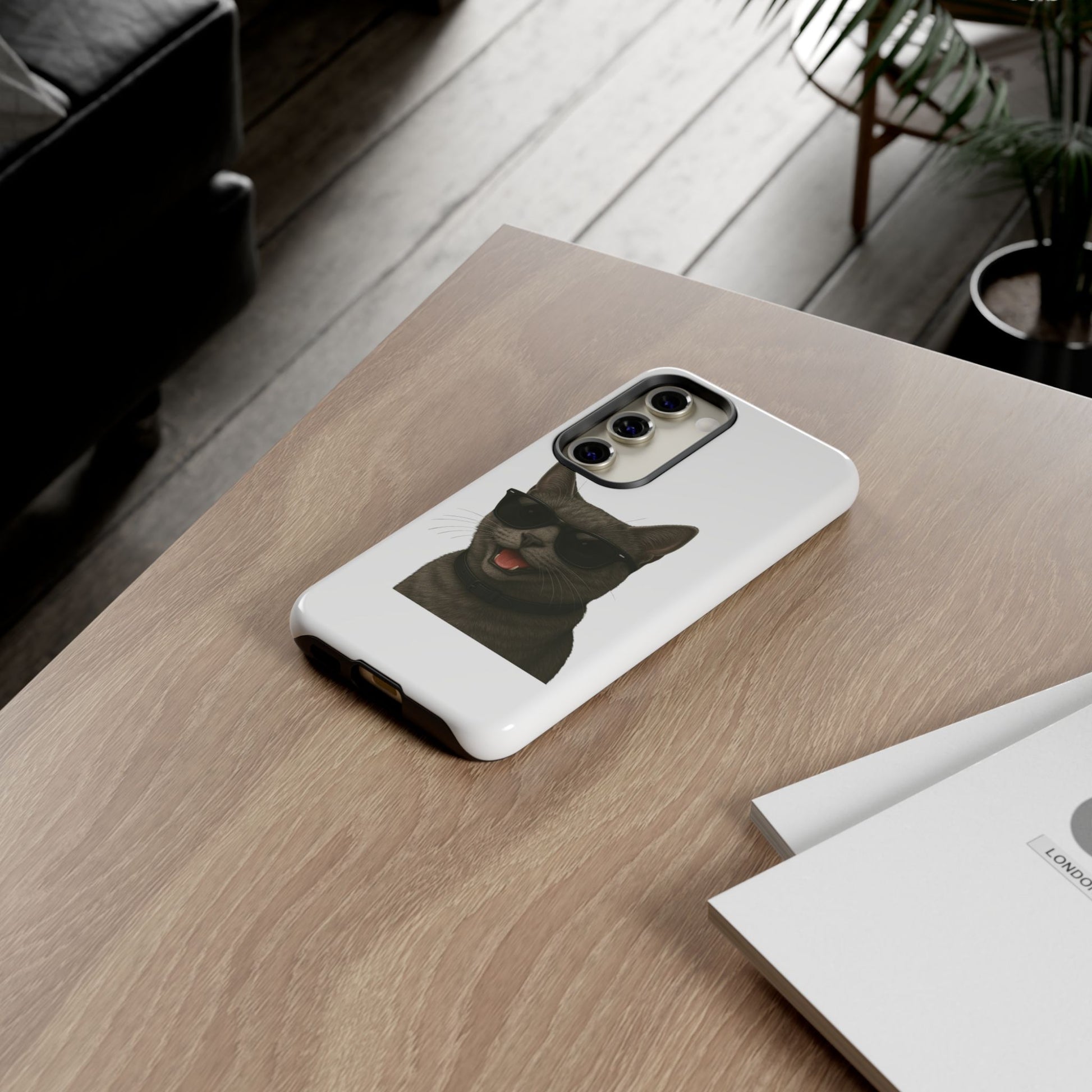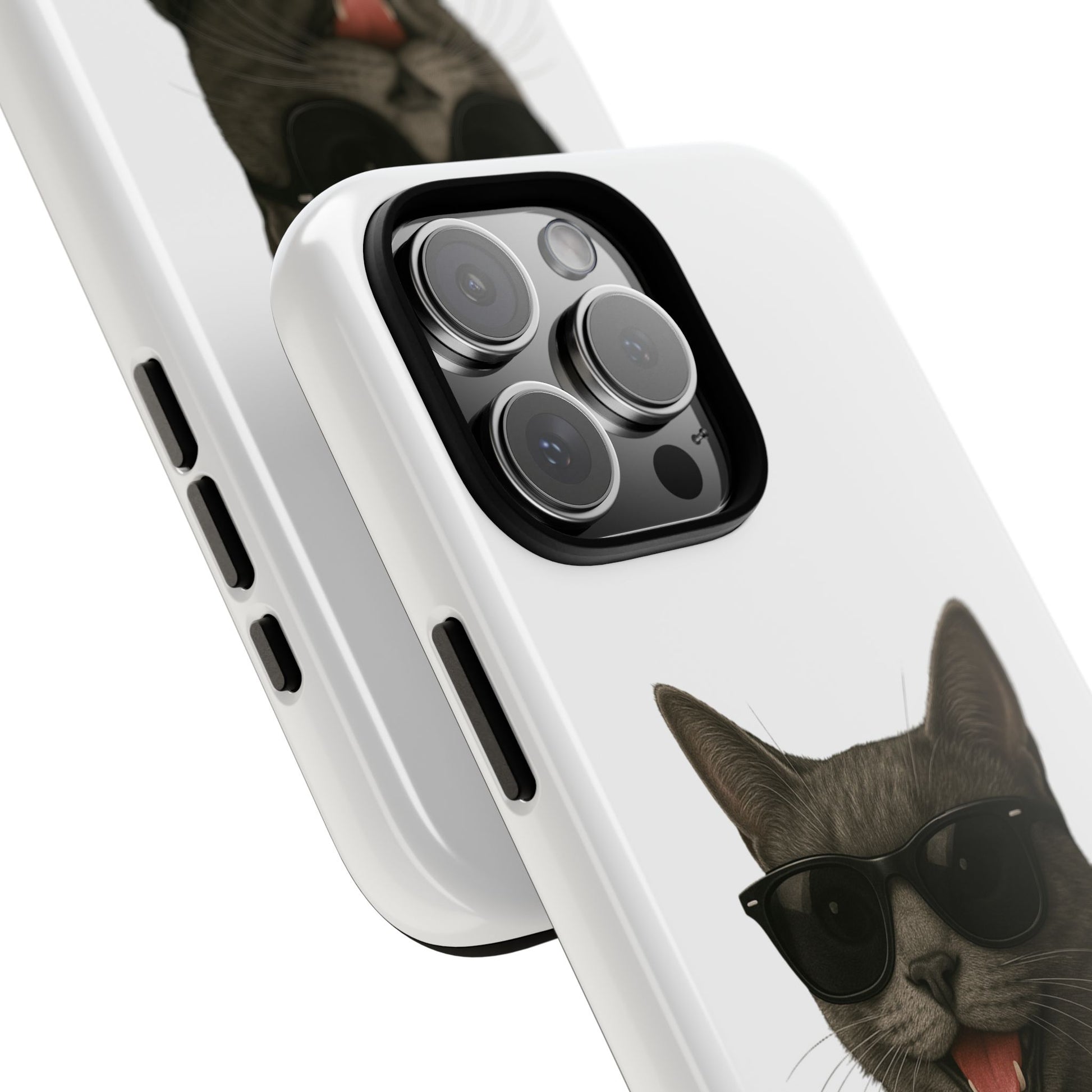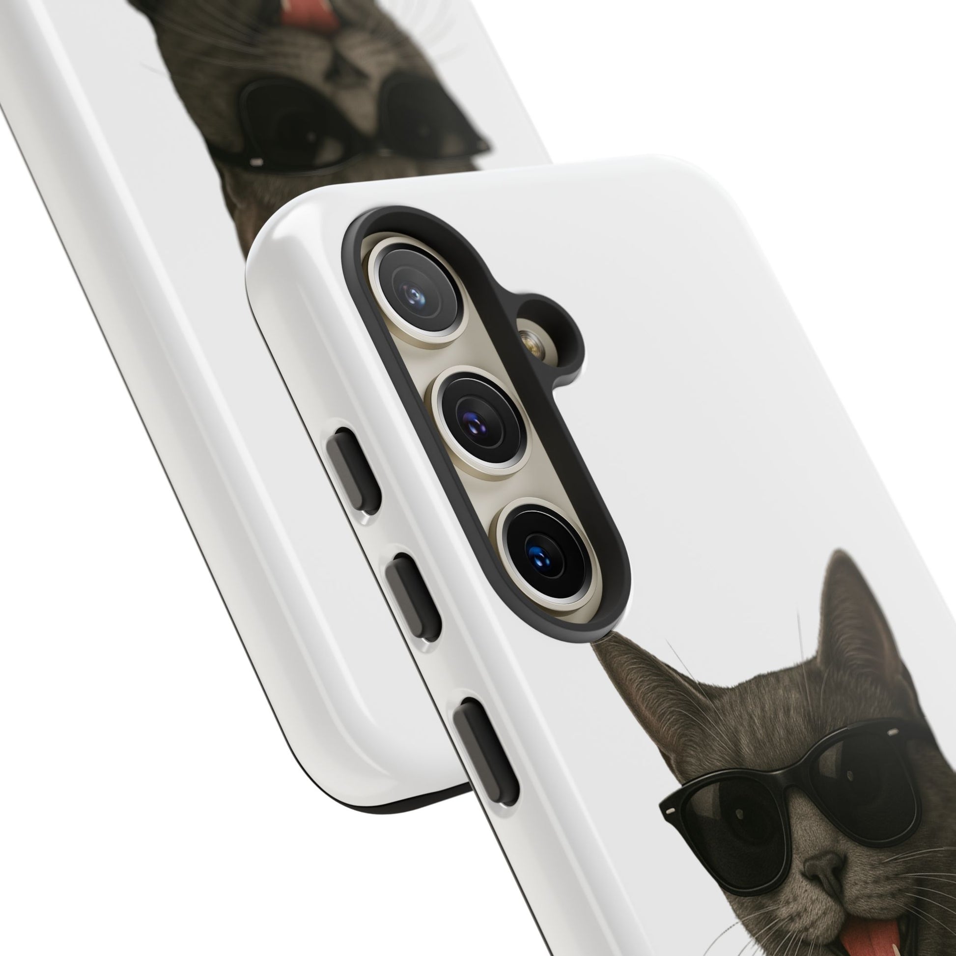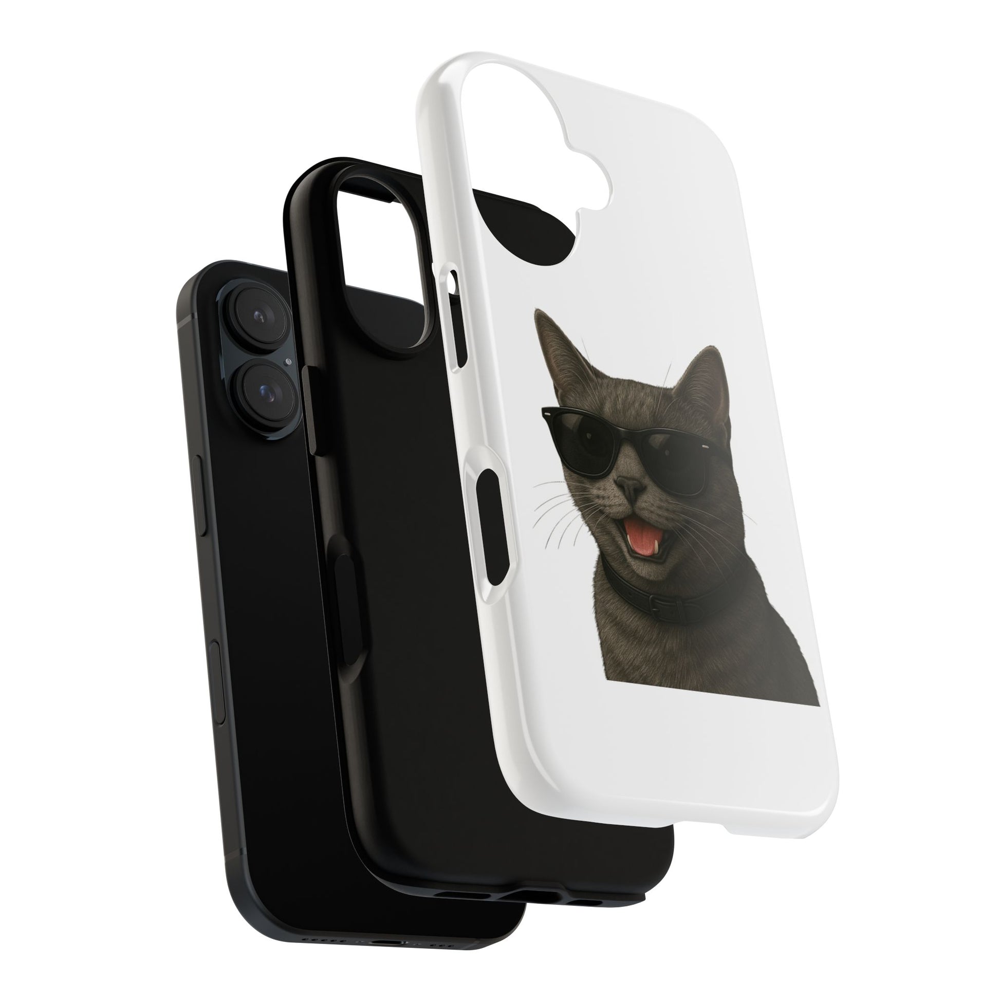 Show off your love for gray cats with this durable tough phone case! Featuring an adorable illustrated Gray Cat portrait wearing cool sunglasses, this case is perfect for cat lovers who want to protect their phone in style.