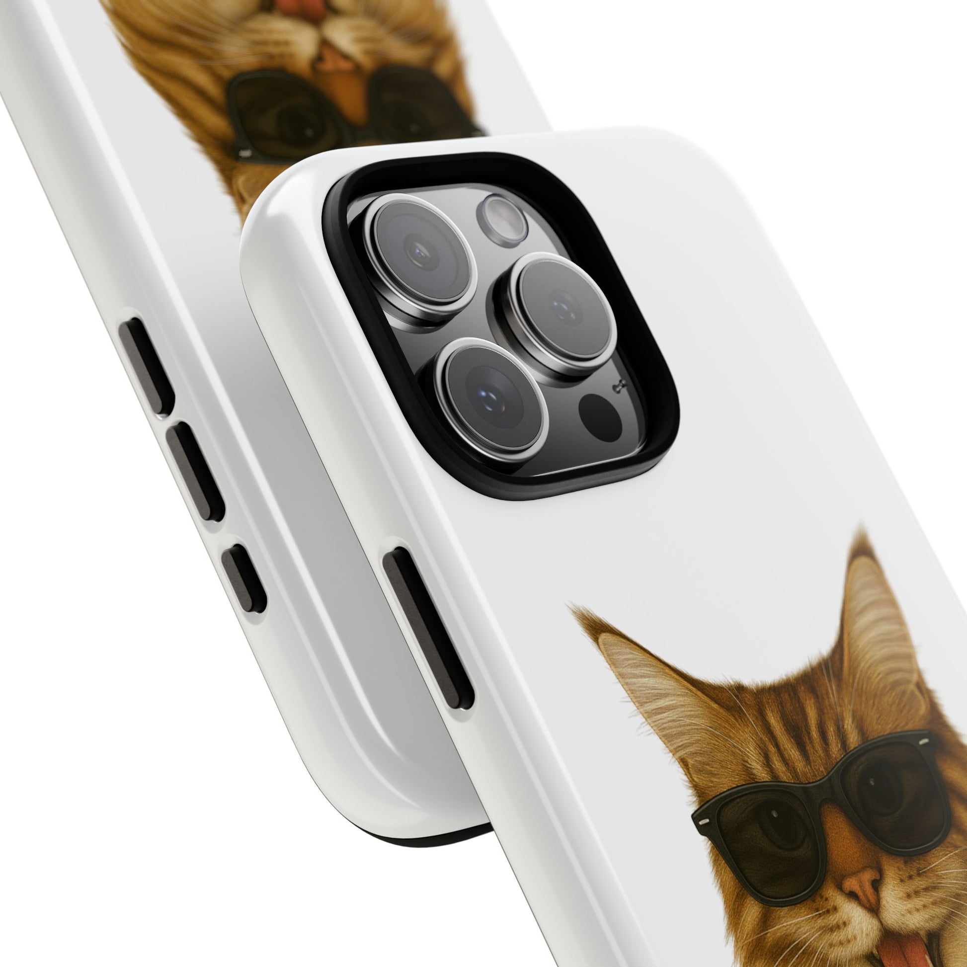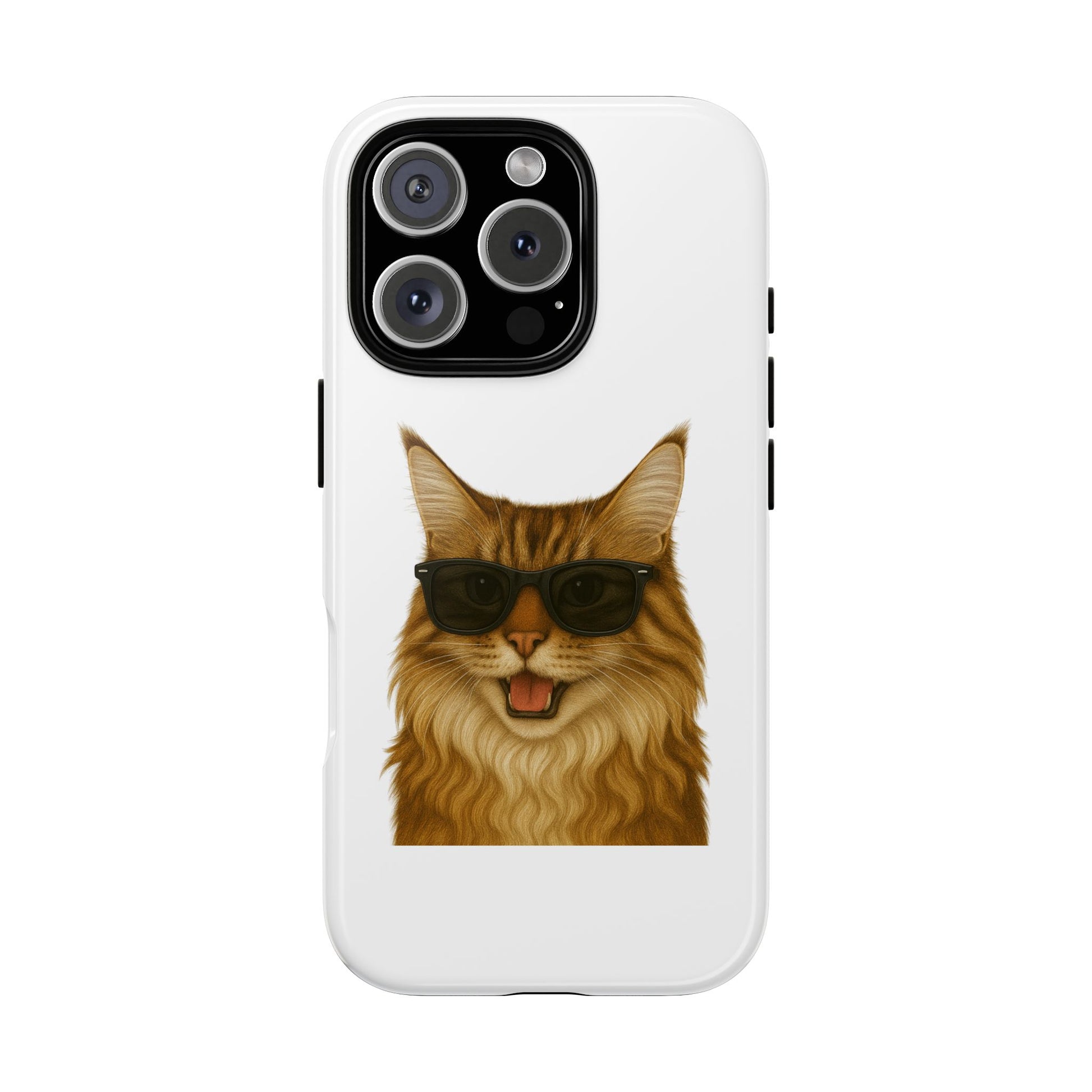 Show off your love for maine coons with this durable tough phone case! Featuring an adorable illustrated Maine Coon portrait wearing cool sunglasses, this case is perfect for cat lovers who want to protect their phone in style.