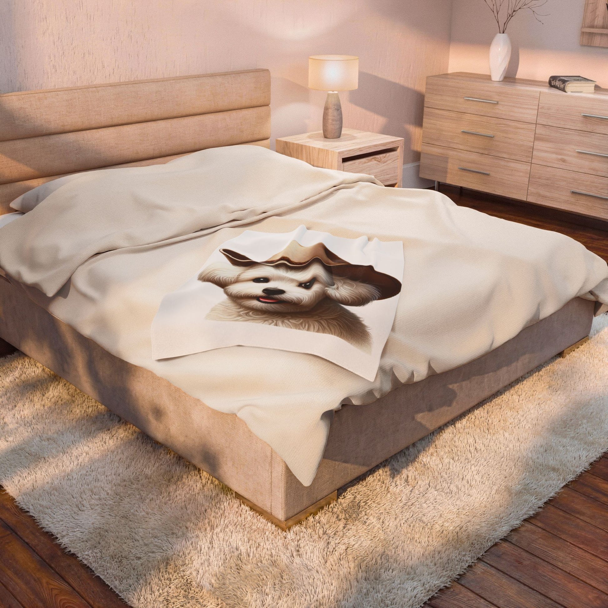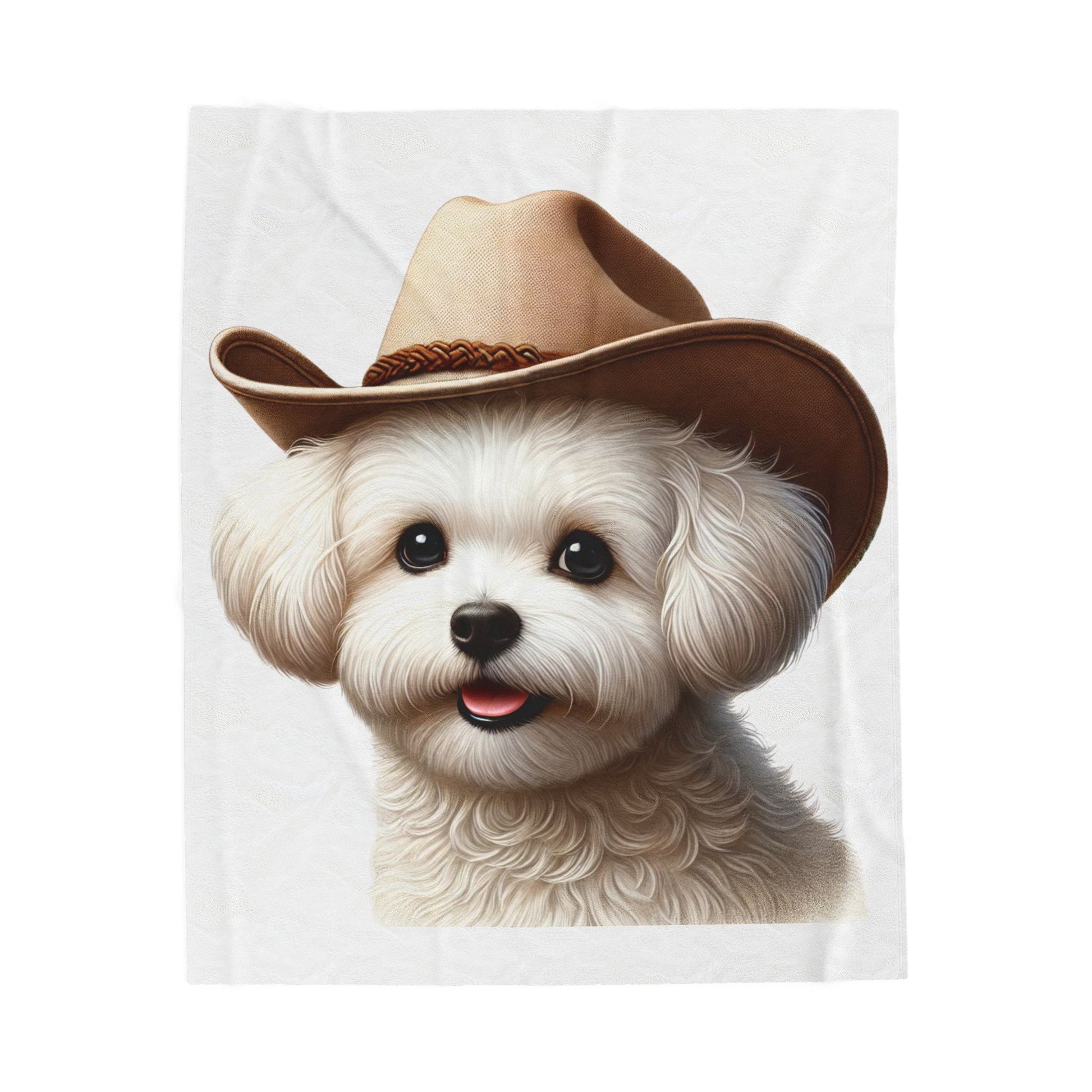 Snuggle up with this cozy Maltese sherpa blanket! Featuring a vibrant illustrated Maltese portrait wearing a charming cowgirl hat, this blanket combines comfort with dog-loving style.