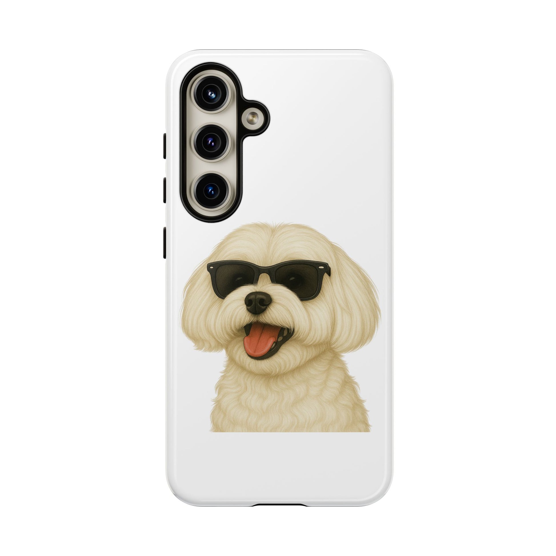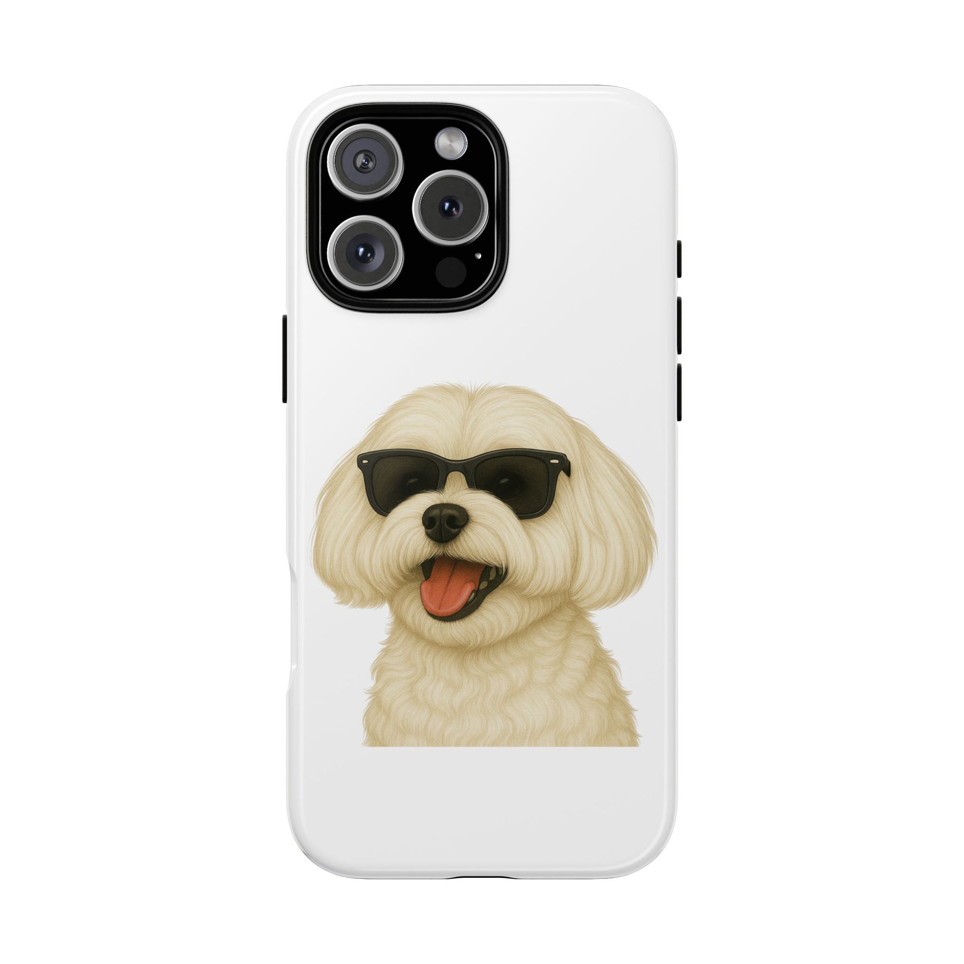 Show off your love for malteses with this durable tough phone case! Featuring an adorable illustrated Maltese portrait wearing cool sunglasses, this case is perfect for dog lovers who want to protect their phone in style.