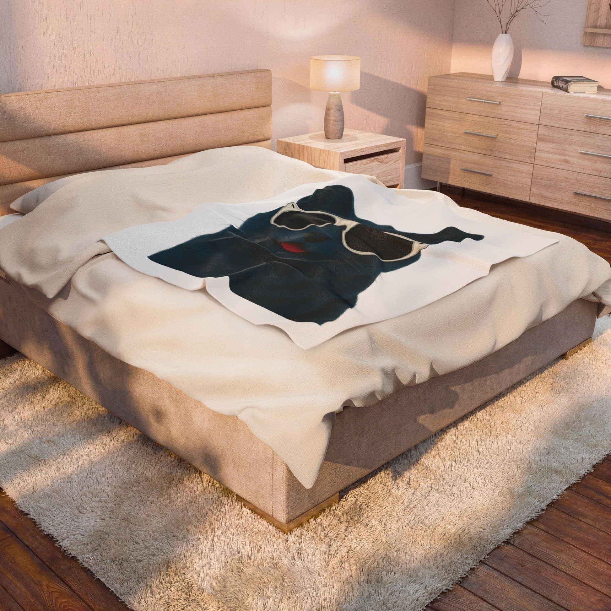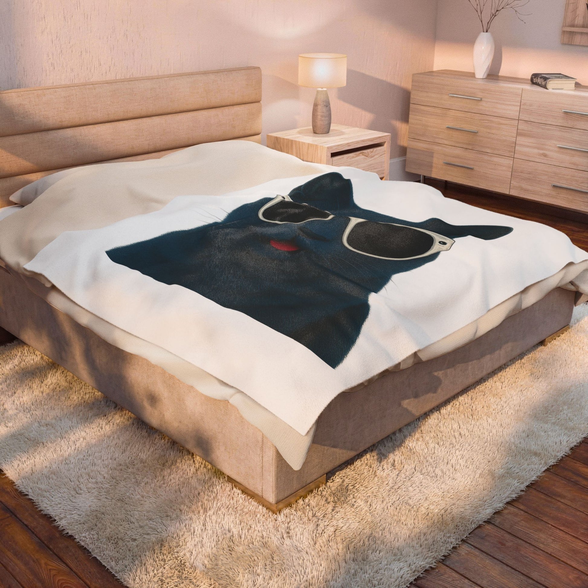 Snuggle up with this cozy Russian Blue Cat sherpa blanket! Featuring a vibrant illustrated Russian Blue Cat portrait wearing cool sunglasses, this blanket combines comfort with cat-lover style.