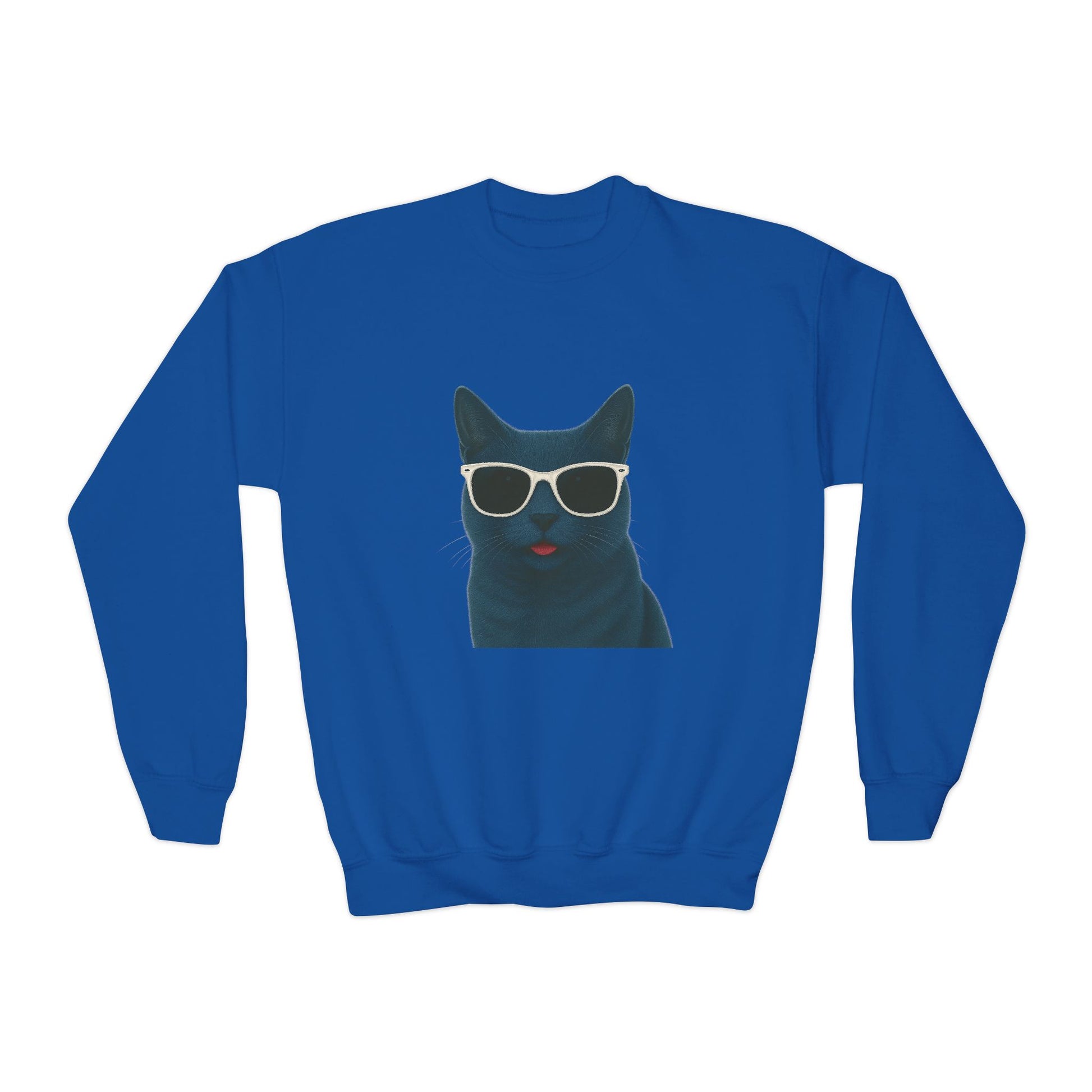 This Youth Sweatshirt features a fun and stylish design of a Russian Blue Cat wearing sunglasses. The medium-heavy fabric and loose fit provide ultimate comfort and durability for children to wear. Perfect for casual everyday wear or as a playful addition to a kid's wardrobe, this sweatshirt is a great choice for cat lovers and animal enthusiasts. Ideal for gifting on birthdays, holidays, or any special occasion.