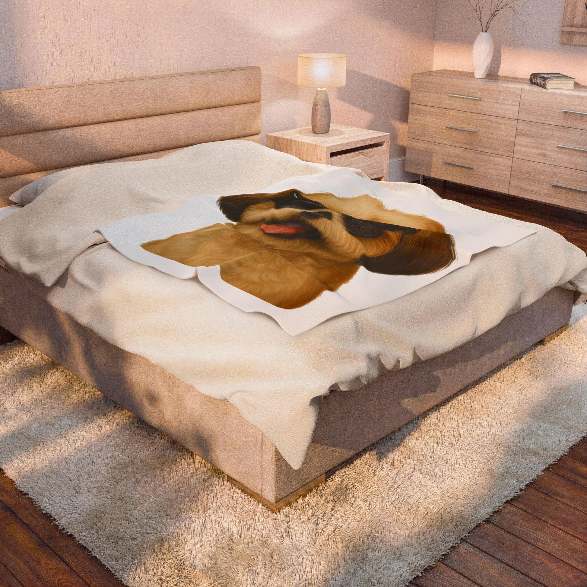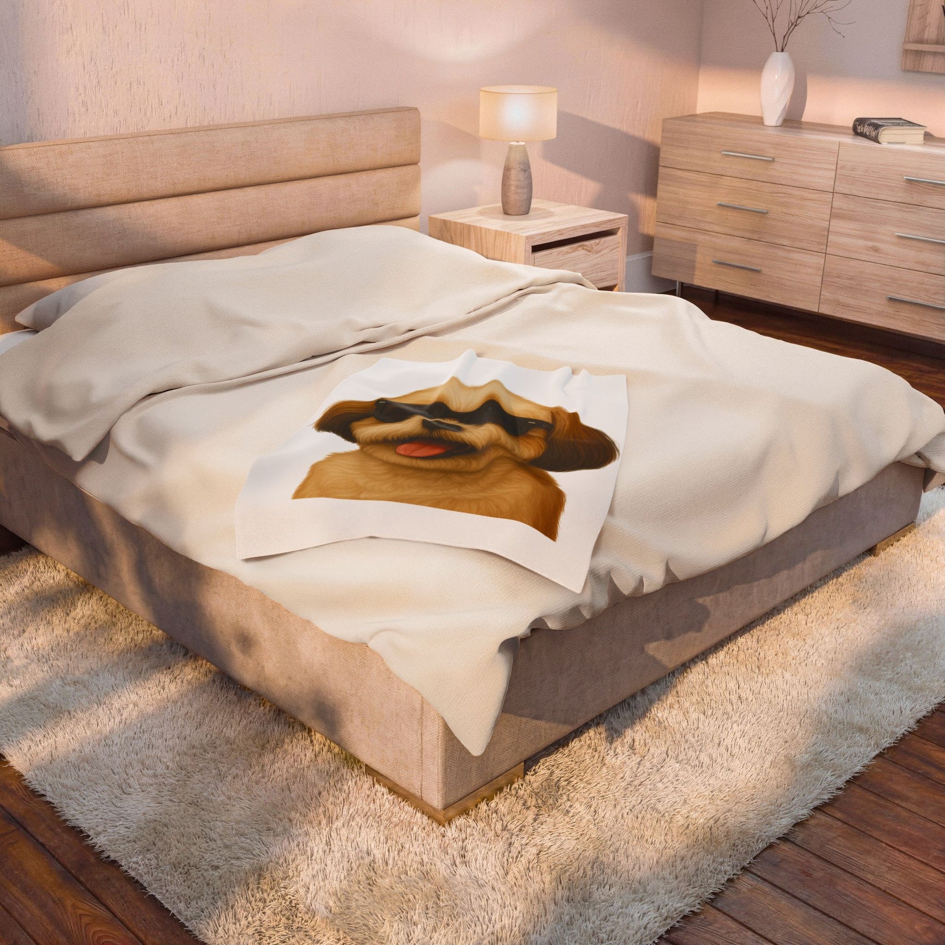 Snuggle up with this cozy Shih Tzu sherpa blanket! Featuring a vibrant illustrated Shih Tzu portrait wearing cool sunglasses, this blanket combines comfort with dog-lover style.