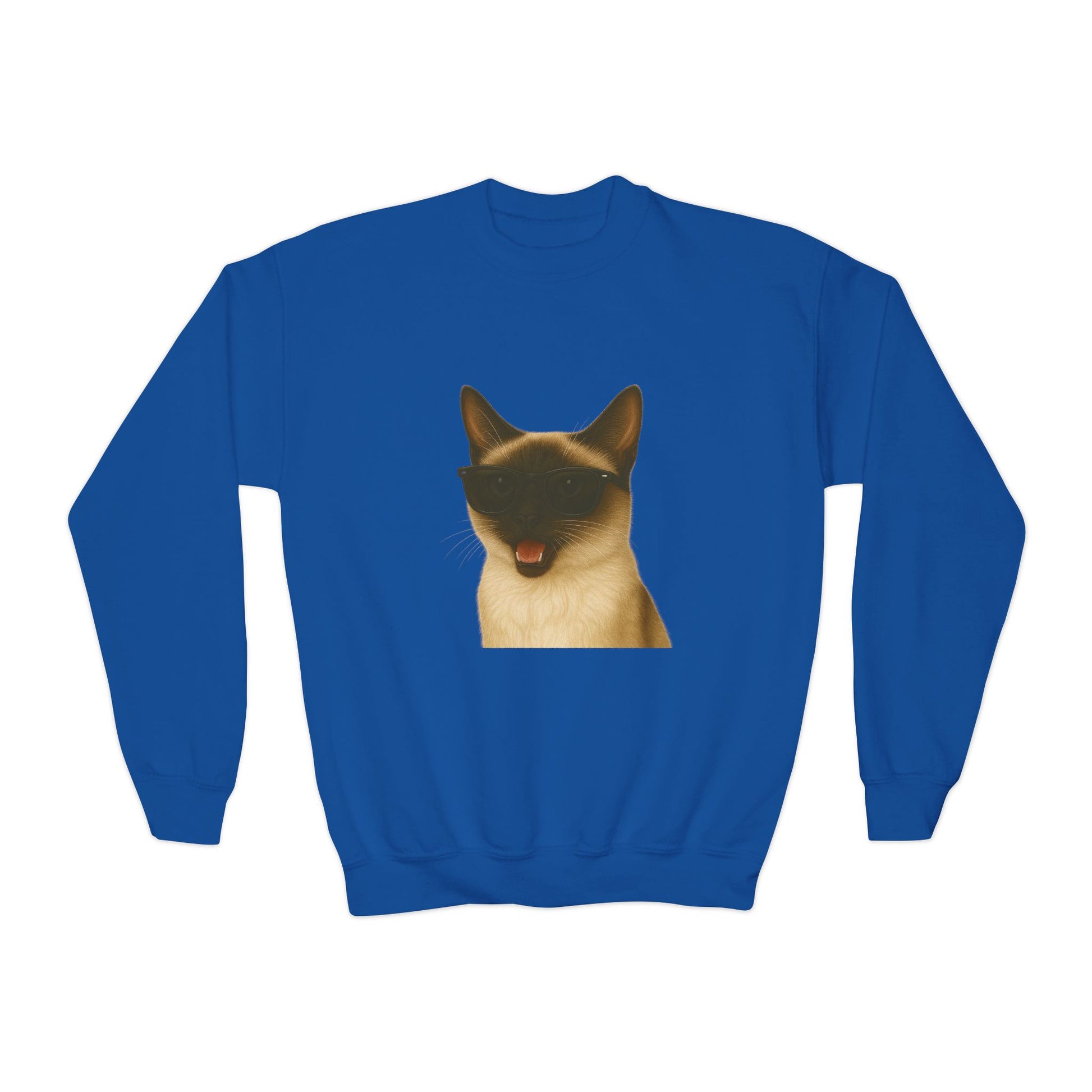 This Youth Sweatshirt features a fun and stylish design of a Siamese Cat wearing sunglasses. The medium-heavy fabric and loose fit provide ultimate comfort and durability for children to wear. Perfect for casual everyday wear or as a playful addition to a kid's wardrobe, this sweatshirt is a great choice for cat lovers and animal enthusiasts. Ideal for gifting on birthdays, holidays, or any special occasion.