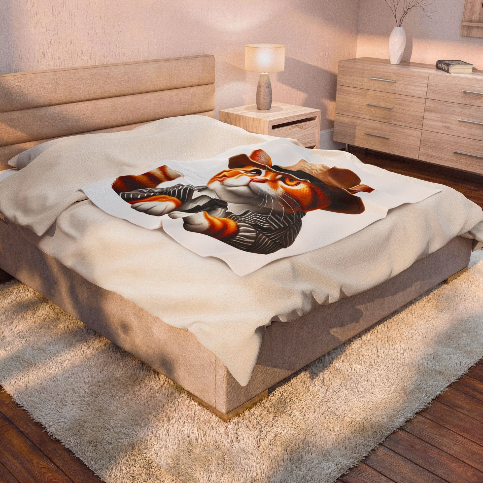Snuggle up with this cozy Tabby Cat sherpa blanket! Featuring a vibrant illustrated Tabby Cat portrait wearing a charming fedora, this blanket combines comfort with cat-loving style.
