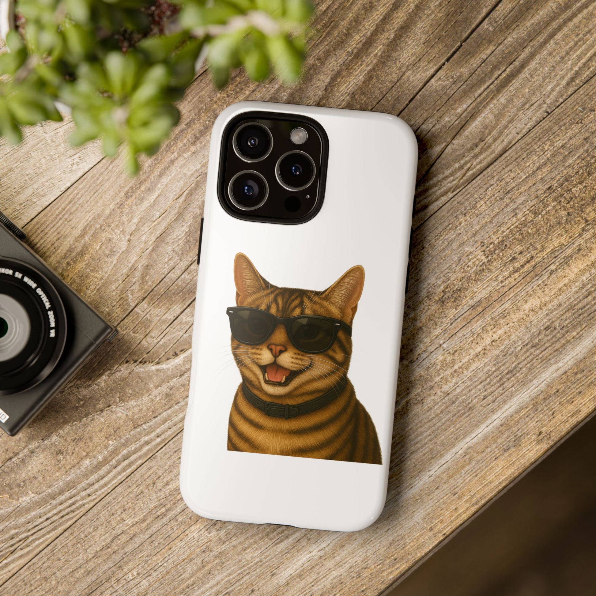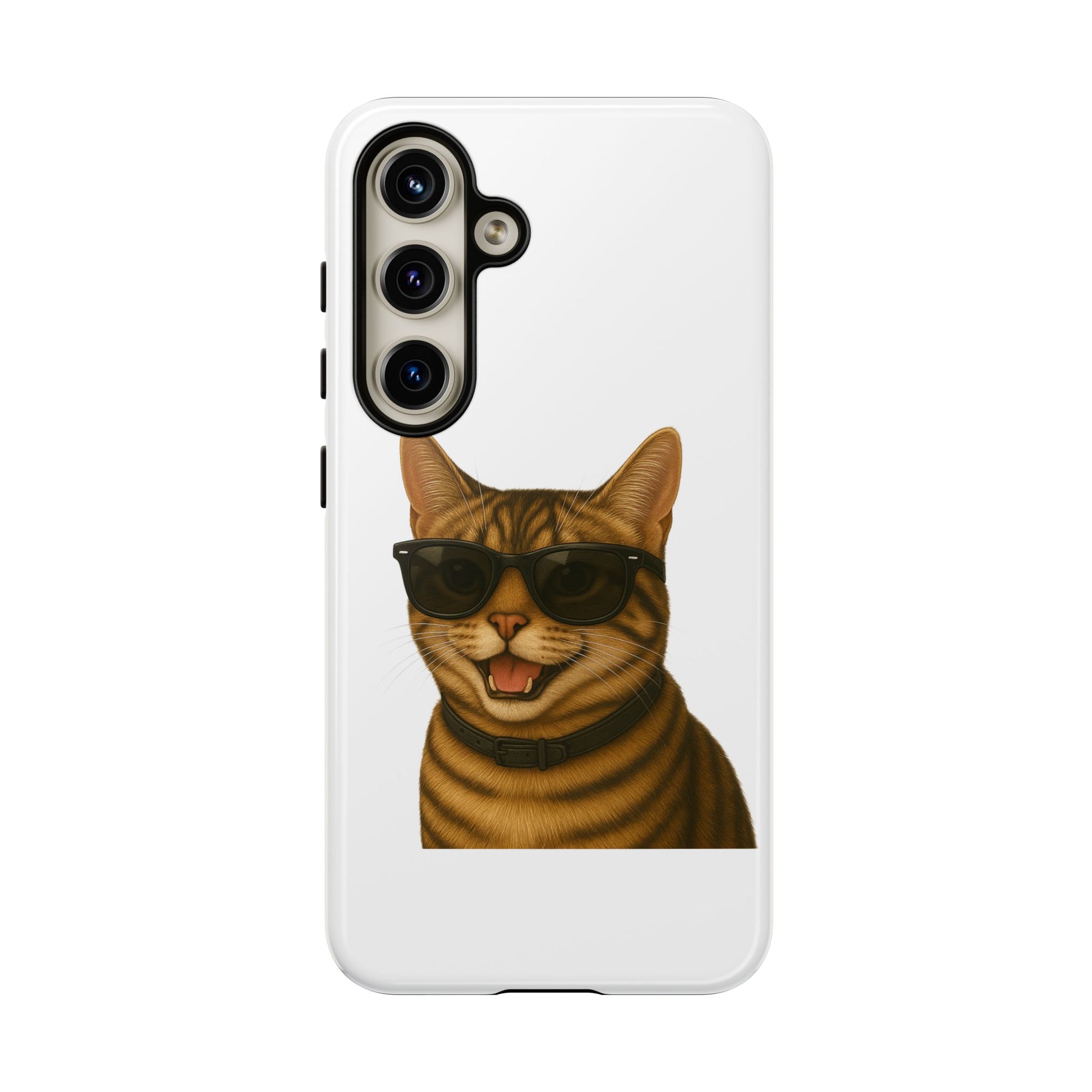Show off your love for tabby cats with this durable tough phone case! Featuring an adorable illustrated Tabby Cat portrait wearing cool sunglasses, this case is perfect for cat lovers who want to protect their phone in style.