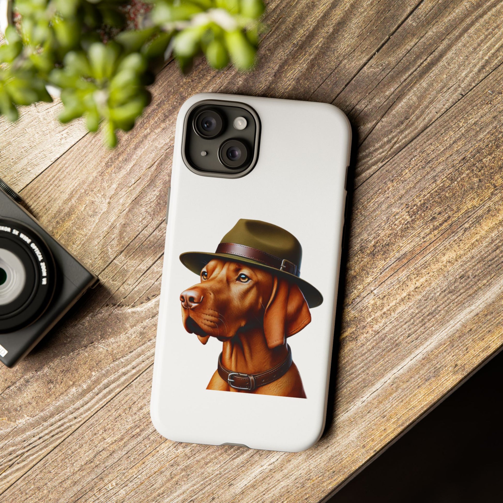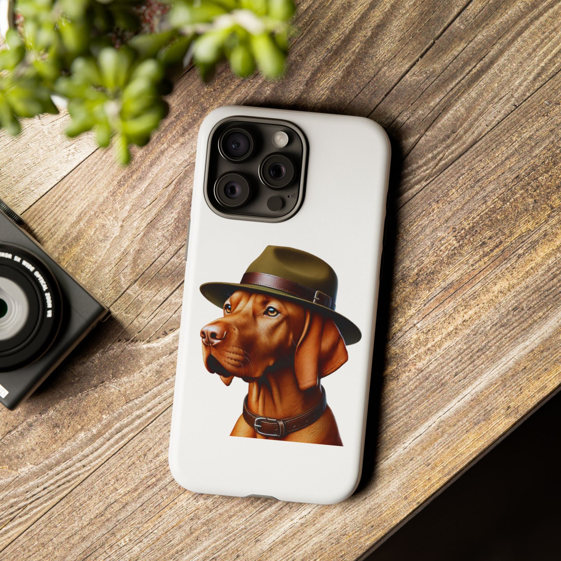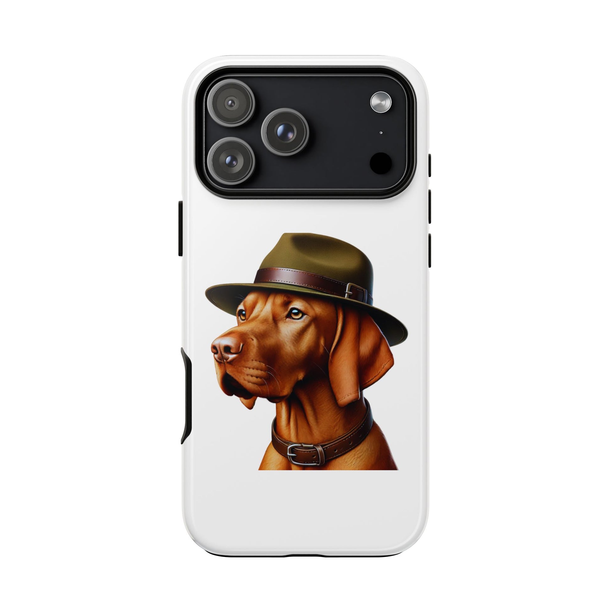 Show off your love for Vizslas with this durable tough phone case! Featuring an adorable illustrated Vizsla portrait wearing a stylish campaign hat, this case is perfect for pet lovers who want to protect their phone in style.